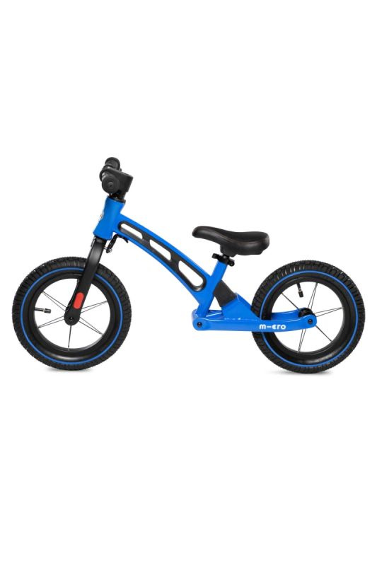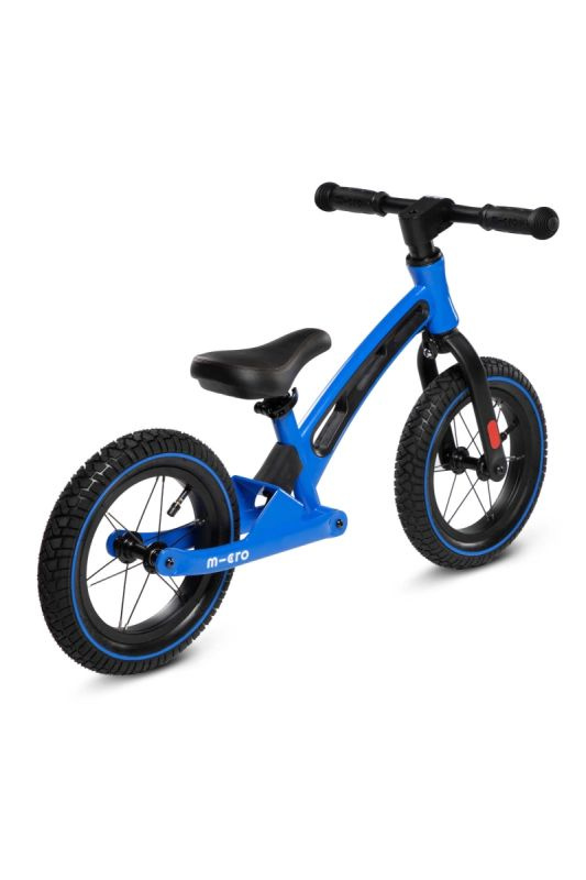 Micro Balance Bike Deluxe ist ein Kinderlaufrad und Laufrad in blauer Farbe mit aufblasbaren 300 mm Rädern, breitem Lenker und Hinterradfederung.