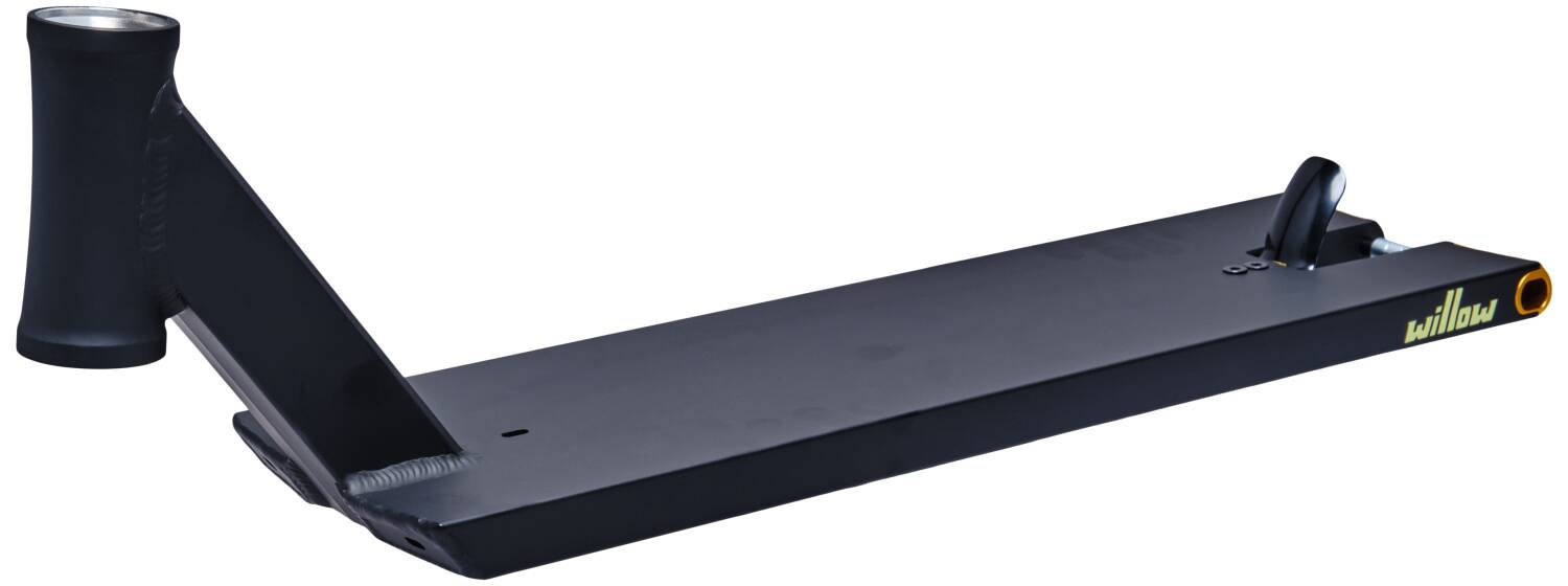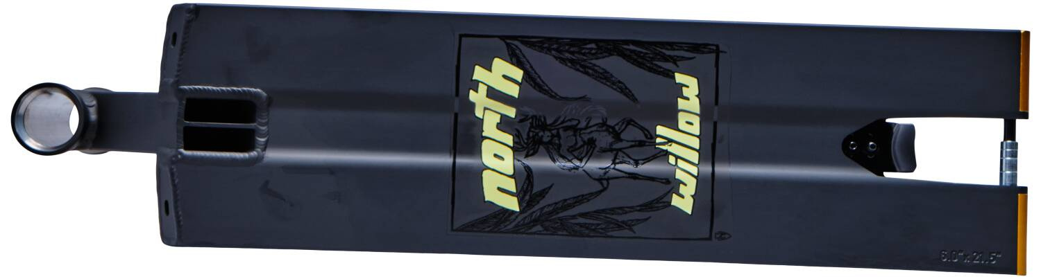 Das Board hat super Abmessungen für die Straße, in der Länge misst es 572 mm (22.5") und in der Breite ist es eine klassische Sechs (152 mm (6")). Footspace der Platten beträgt hervorragende 426 mm. Material der Platte ist hochwertiges Aluminium 6061 mit einer Festigkeitsklasse T6, die Platte wird aus einem Stück gefertigt. Das Ende des Boards ist das sogenannte Box-End, das spezifisch für Street-Boards ist. In die Platte passen Rollen mit maximalen Abmessungen von 125 x 30 mm.