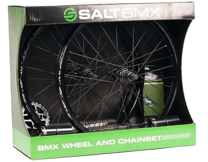Das Valon Rad/Kettenset von Salt enthält zwei Valon Felgen auf 36h Salt Naben, eine Vorderradnabe mit Achse und losen Kugeln sowie einen teilweise geschlossenen 9t Hinterradantrieb, eine Salt AM Kette (510H), ein Salt AM Kettenblatt mit 25 Zähnen und ein AM Peg-Set für 14 und 10 mm Achsen.